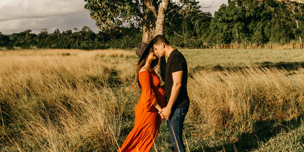 pregnant-woman-in-orange-dress-kissing-man-in-open-field-with-tall-grass-and-green-trees